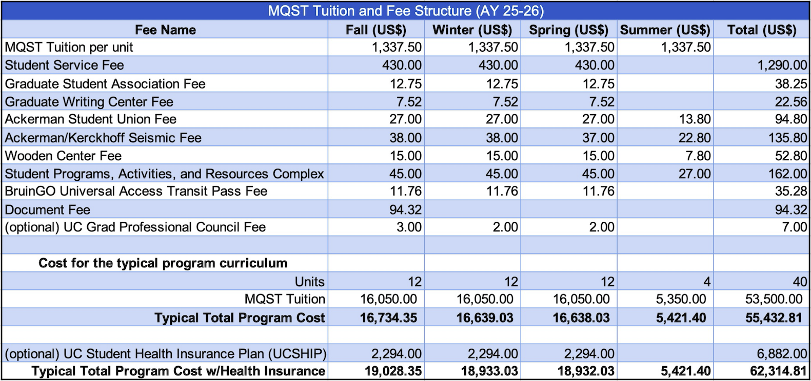 The Tuition and estimated Fees for this academic year, 2025-2026, are given in the table below. Tuition and Fees for AY 2026-2027 are expected to be similar and will be posted in mid 2026. Please be aware that MQST is a self-supporting degree program and has a different fee structure than other academic graduate programs at UCLA. Please refer to the Registrar's Office for more information about self-supporting degree program fees.